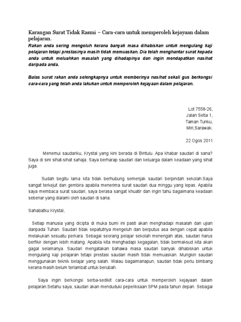 Contoh surat kiriman tidak rasmi format spm ia bukan saja penting pada peperikasaan upsr pt3 spm atau stpm tetapi juga sering digunakan pada .